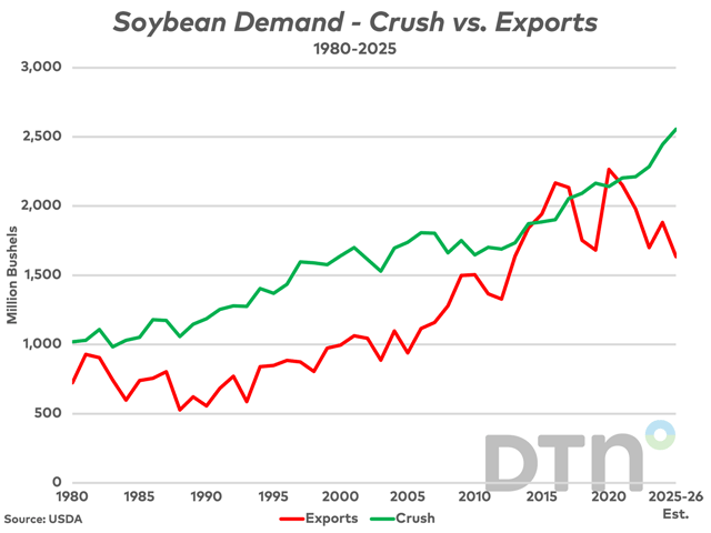 I enjoyed writing this column and I think it is very important because it keeps the dynamics of the soybean market in perspective. Specifically, with so much media attention in 2025 going to the trade war with China and the resulting slump in soybean exports, I felt the impressive growth in crush demand was being overlooked. Also, given that the U.S. has only exported more soybeans than have been crushed domestically in four years throughout history, I wanted to take a moment to give the spotlight to the industry as the demand leader.
